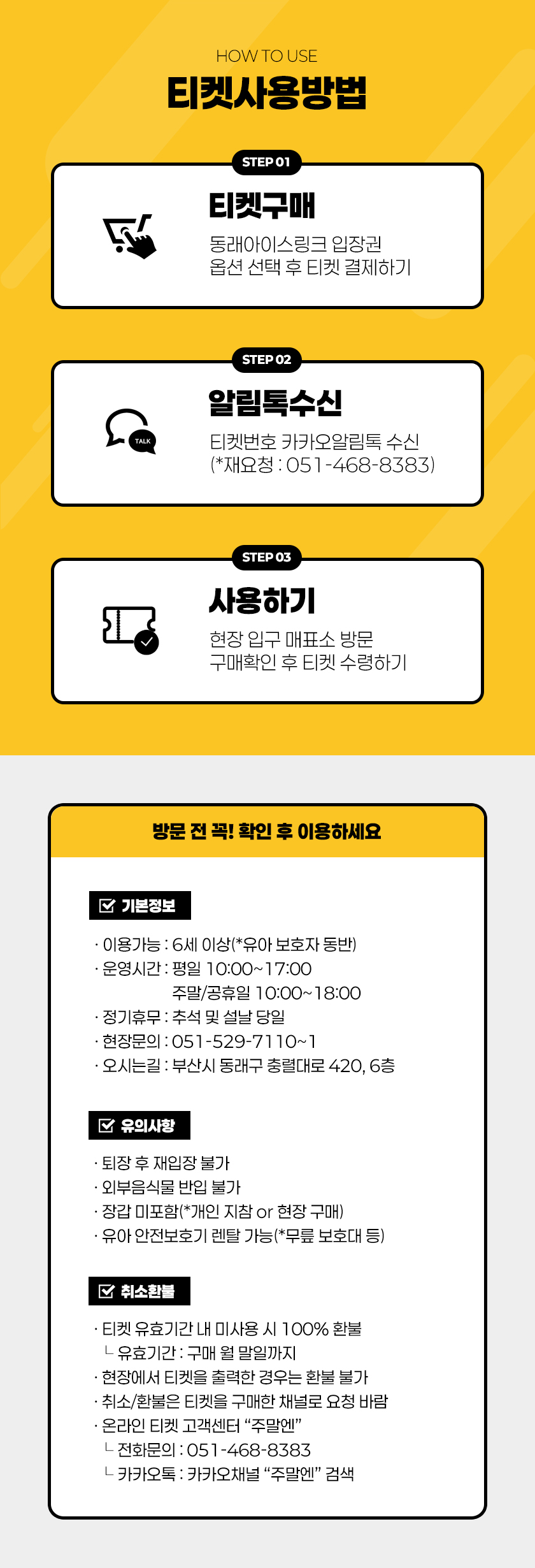 ㆍ①티켓구매 → ②알림톡 수신 → ③매표소 본인 확인 후 입장(*성함,연락처)