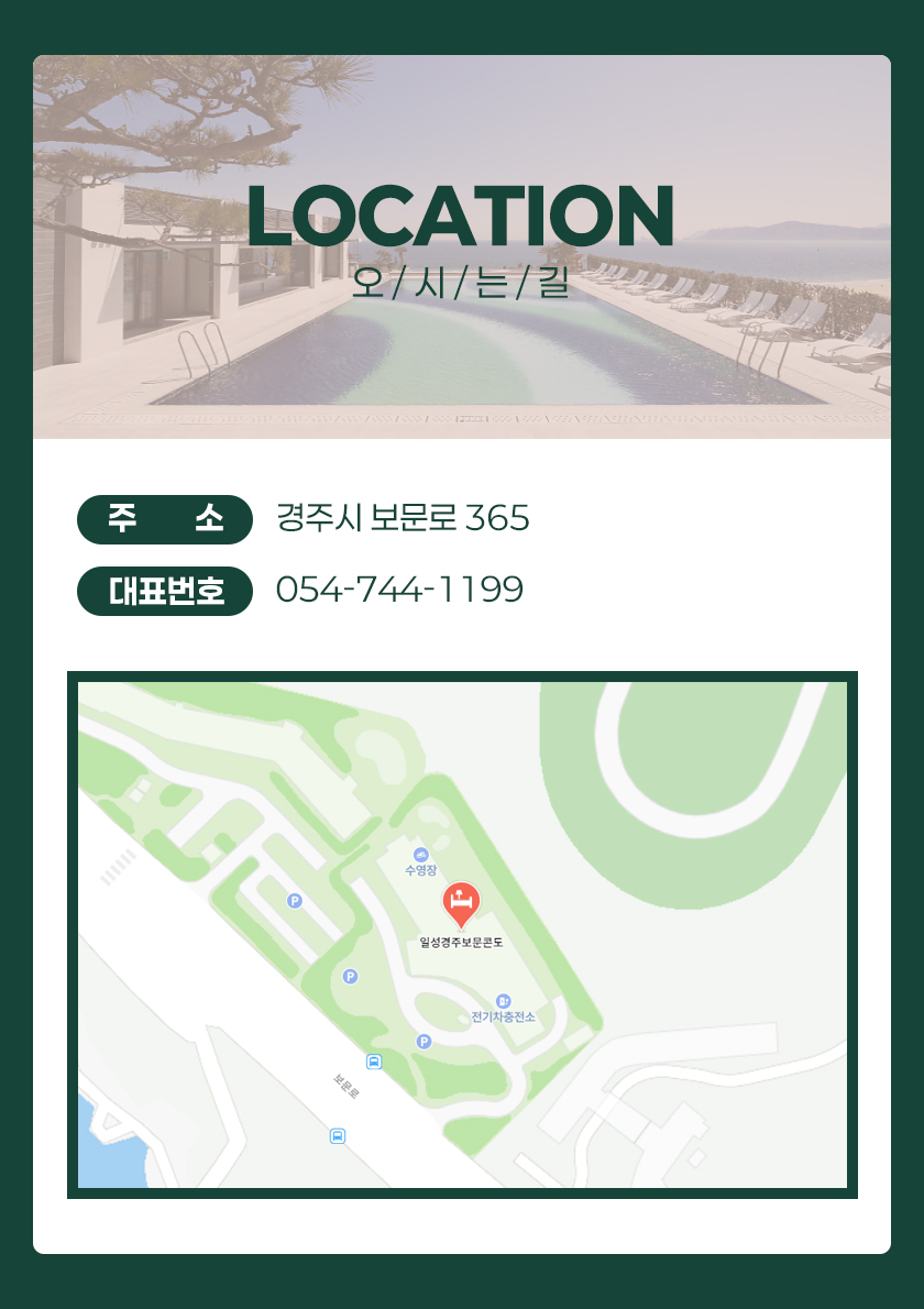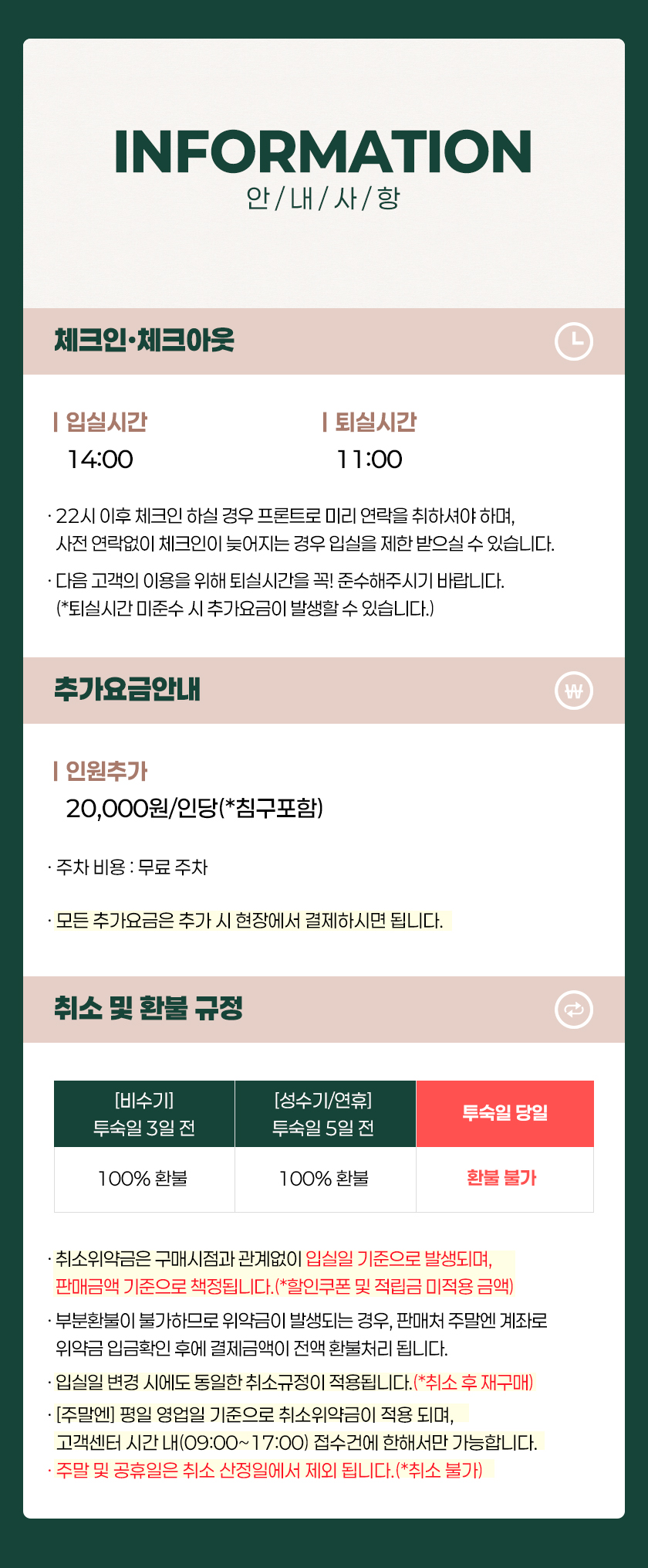 · ①예약 건 결제 → ②예약번호 수신(*확정) → ③예약일 이용 → ④예약일 프론트 체크인 진행(*예약자 성함,연락처,예약번호)
