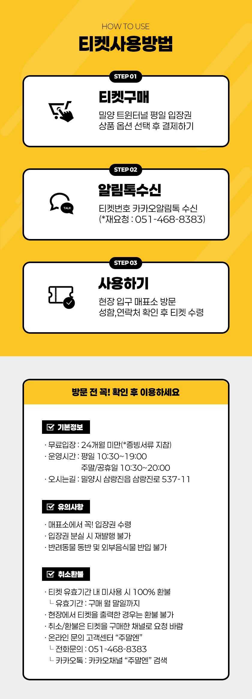 ㆍ①티켓구매 → ②알림톡 수신 → ③매표소 본인 확인 후 입장(*성함,연락처)
