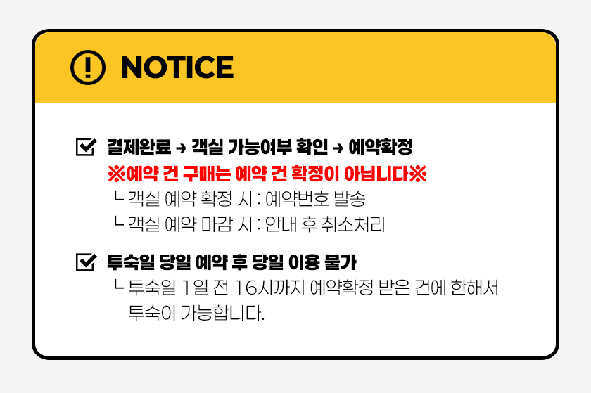 · 객실 마감일 경우, 예약 건 안내 후 취소처리됩니다.