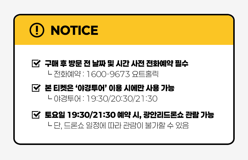 ㆍ①티켓구매 → ②알림톡 수신 → ③요트홀릭 1600-9673 투어 예약 → ④예약일 요트홀릭 선착장 본인 확인 후 승선