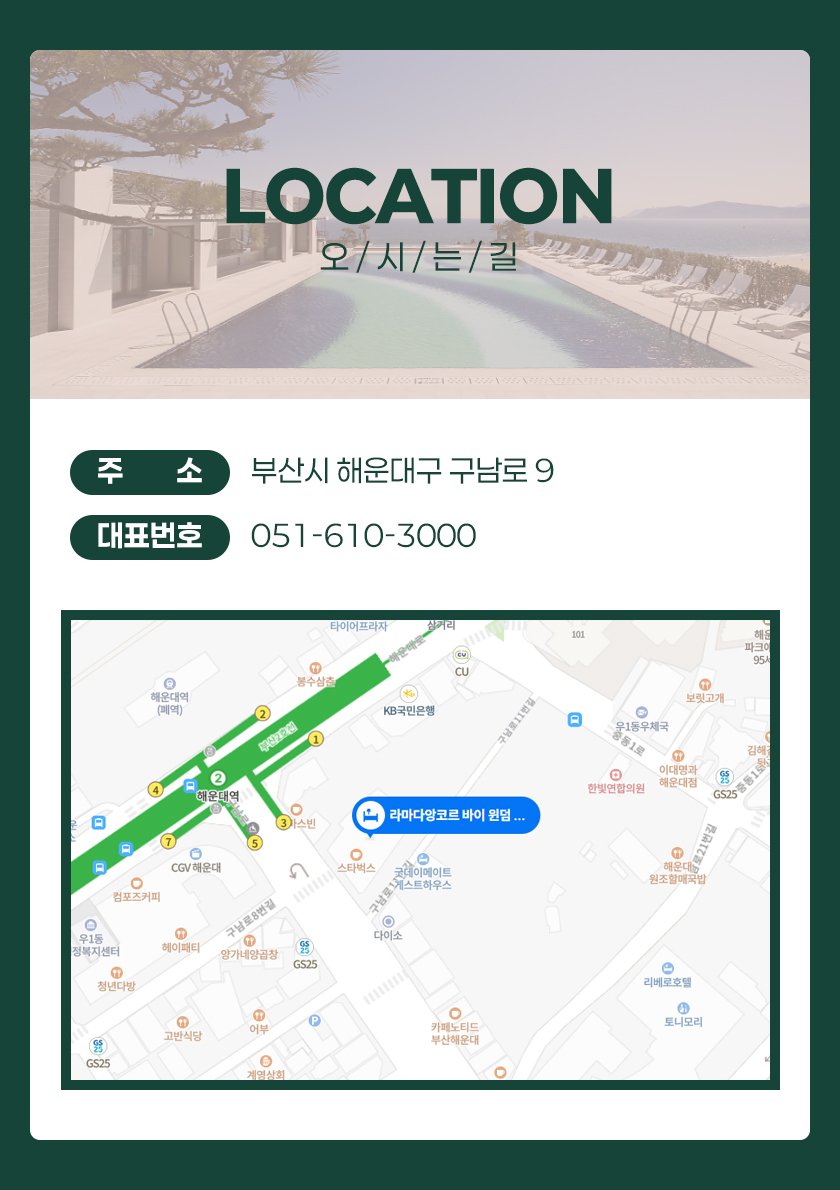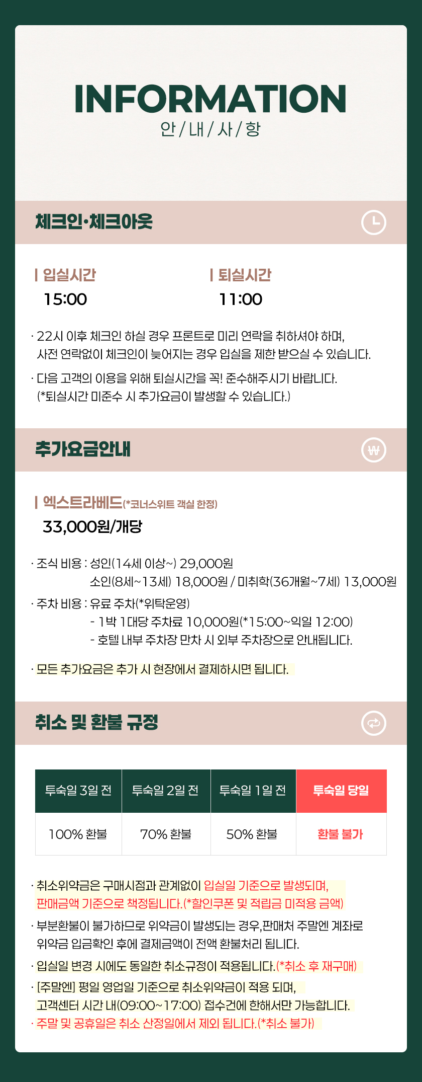 · ①예약 건 결제 → ②예약번호 수신(*확정) → ③예약일 이용 → ④예약일 프론트 체크인 진행(*예약자 성함,연락처,예약번호)