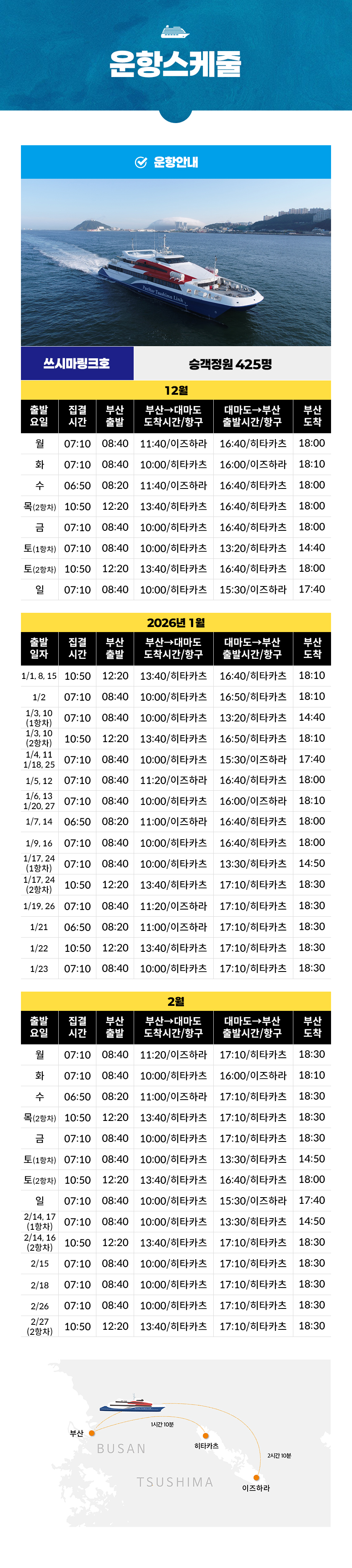 ㆍ2026년 1월 29일(목)~2월 11일(수) 쓰시마링크호 정기운항 점검(도크)기간으로 운항이 없습니다.