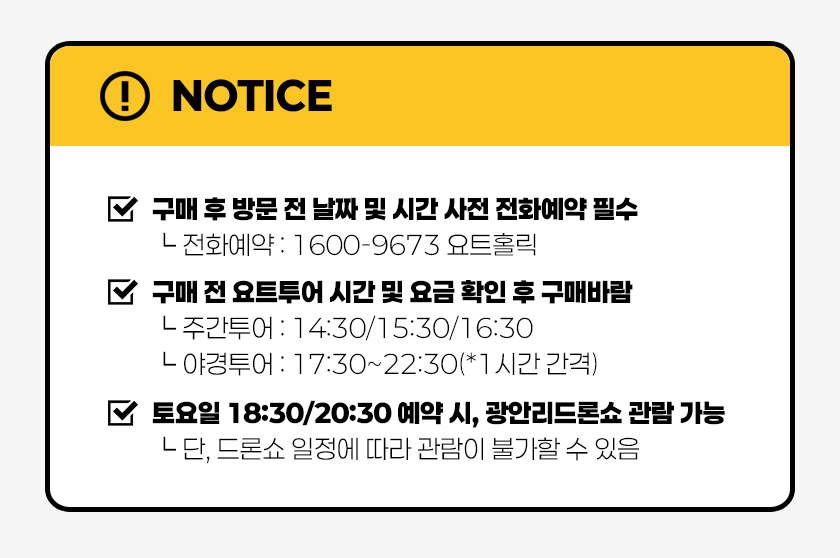 ㆍ①티켓구매 → ②알림톡 수신 → ③요트홀릭 1600-9673 투어 예약 → ④예약일 요트홀릭 선착장 본인 확인 후 승선