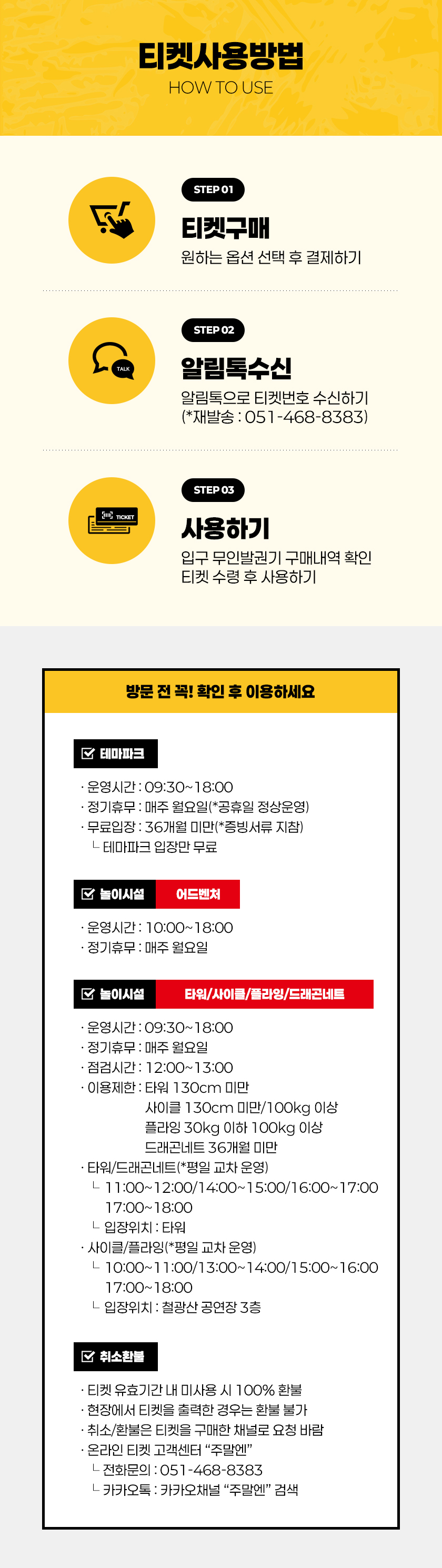 ㆍ①티켓구매 → ②알림톡 수신 → ③현장 무인발권기 구매 확인 후 티켓 수령(*성함,연락처)