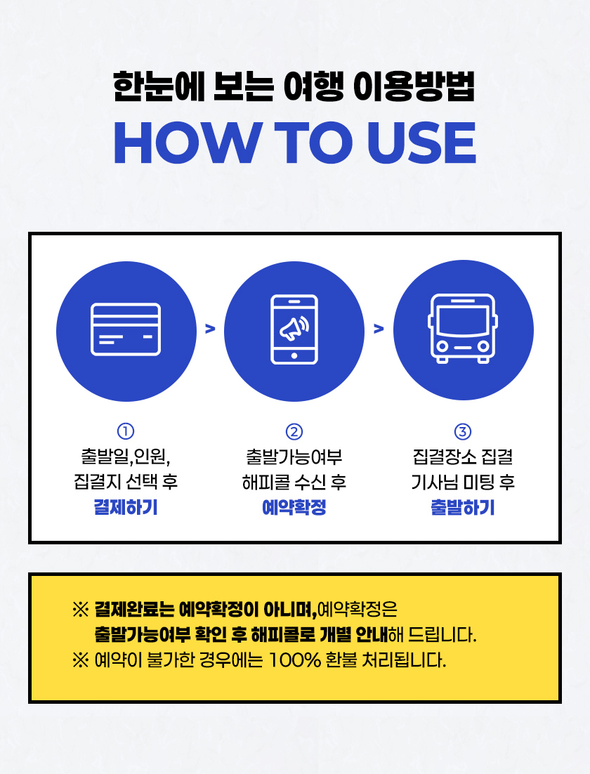 ㆍ①날짜,인원 선택 후 결제 → ②예약가능여부 확인 후 해피콜 → ③탑승자 전원 명단 전달(성함,생년월일,성별,개별연락처)