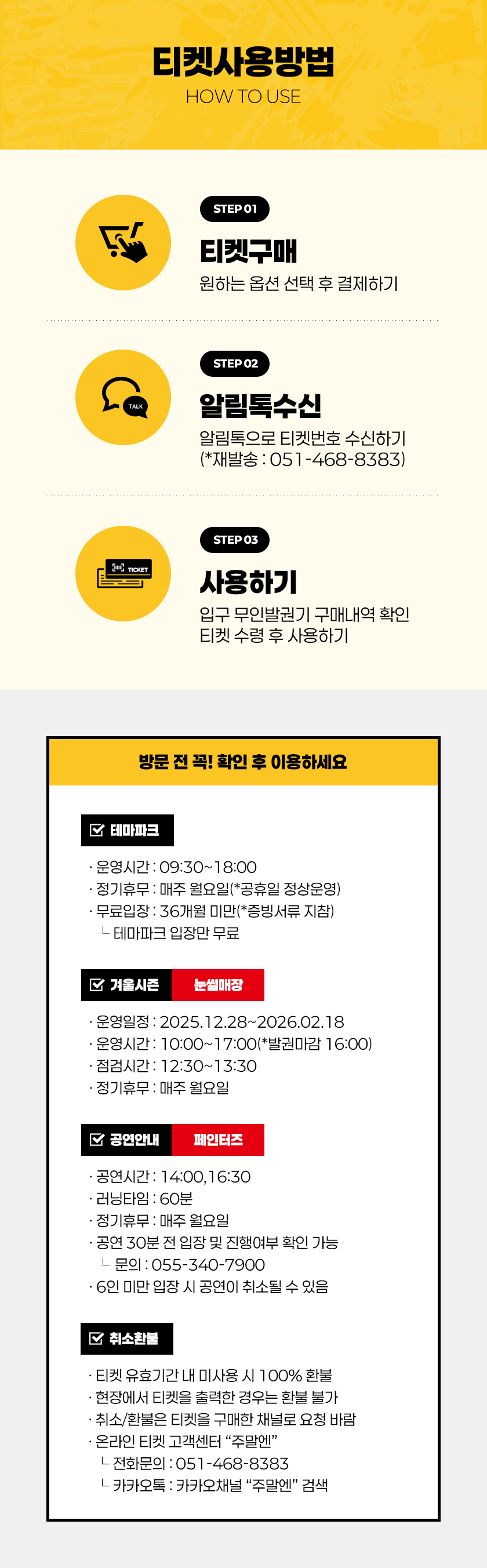 ㆍ①티켓구매 → ②알림톡 수신 → ③현장 무인발권기 구매 확인 후 티켓 수령(*성함,연락처)