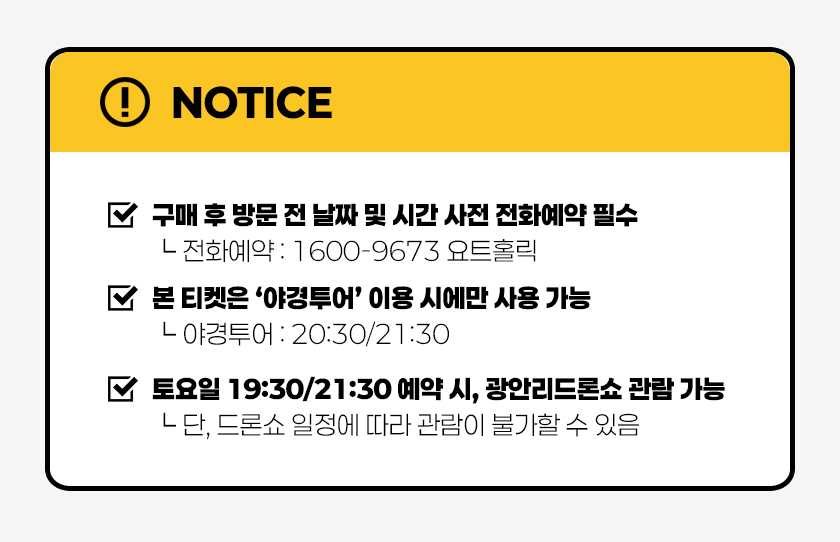 ㆍ①티켓구매 → ②알림톡 수신 → ③요트홀릭 1600-9673 투어 예약 → ④예약일 요트홀릭 선착장 본인 확인 후 승선