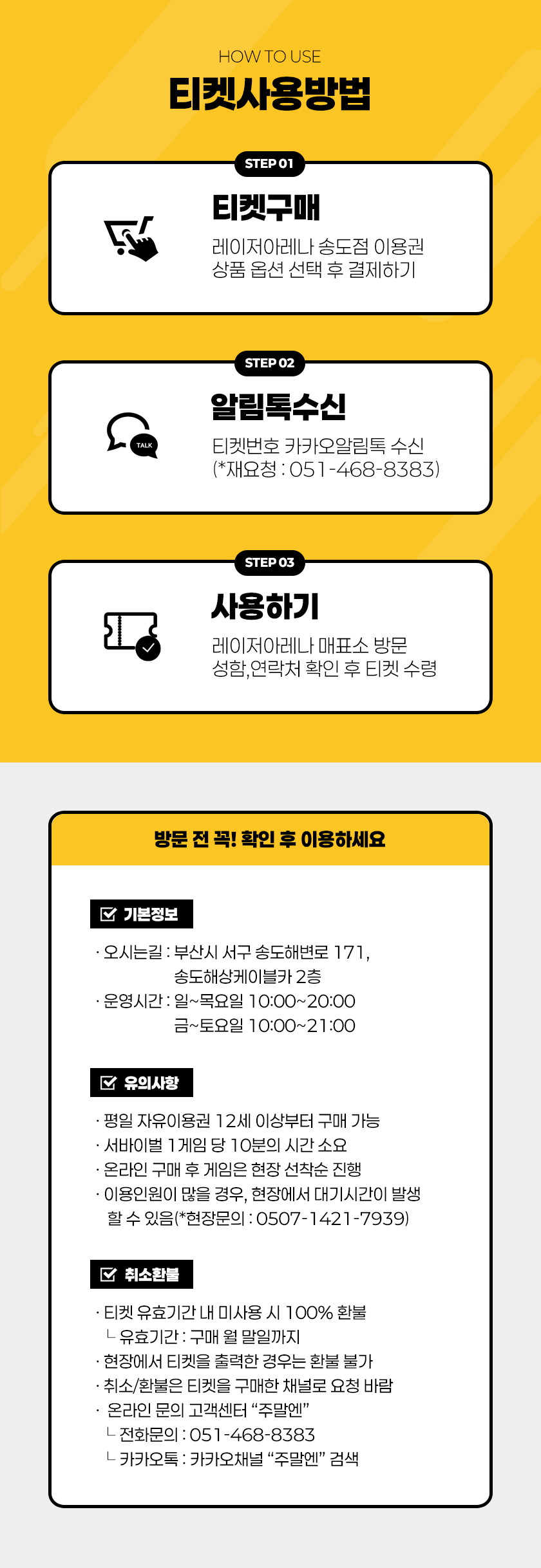 ㆍ①티켓구매 → ②알림톡 수신 → ③매표소 본인 확인 후 입장(*성함,연락처)