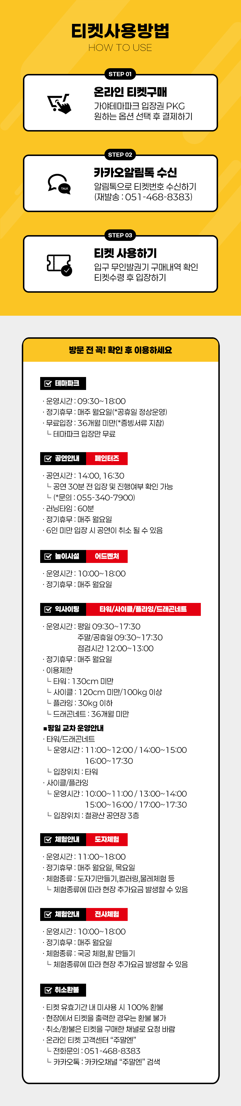 ㆍ①티켓구매 → ②알림톡 수신 → ③현장 무인발권기 구매 확인 후 티켓 수령(*성함,연락처)