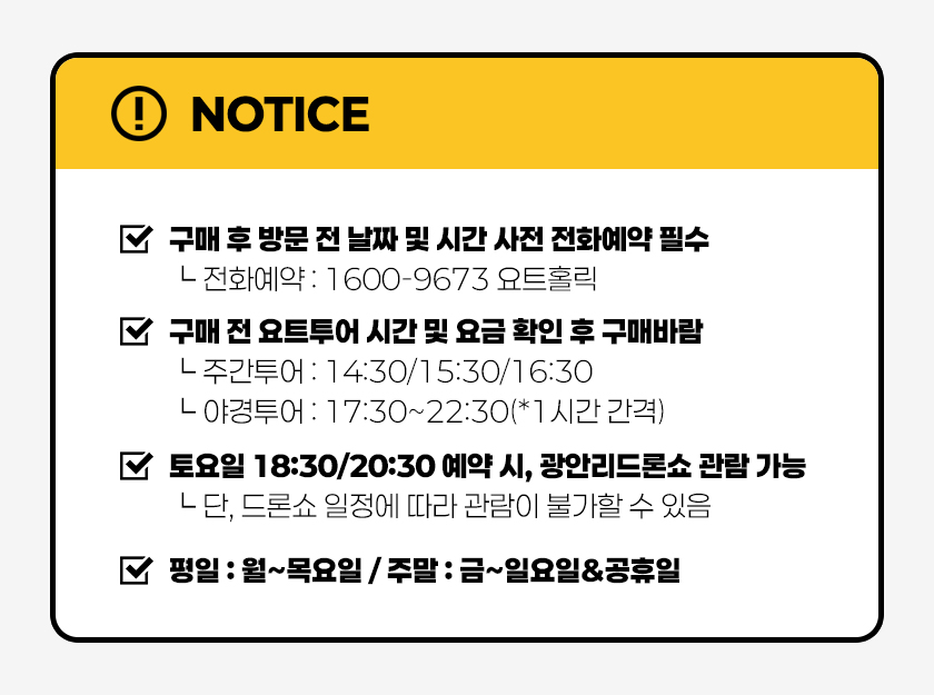 ㆍ①티켓구매 → ②알림톡 수신 → ③요트홀릭 1600-9673 투어 예약 → ④예약일 요트홀릭 선착장 본인 확인 후 승선